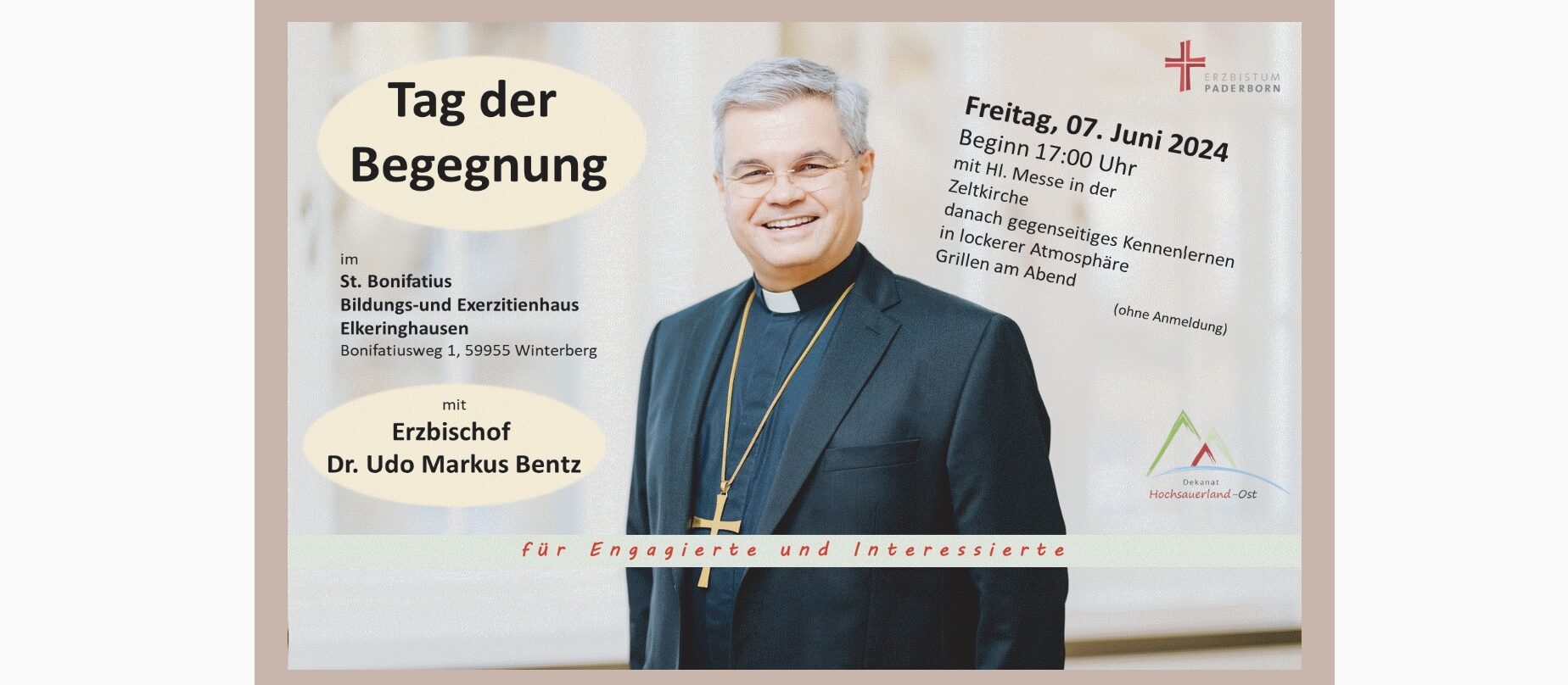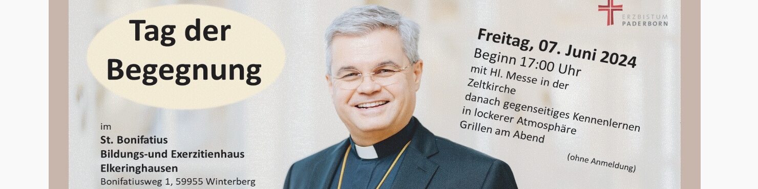 Nachdem unser neuer Erzbischof Dr. Udo Markus Bentz am 10. März in sein Amt eingeführt wurde, besucht er nun alle Dekanate im Erzbistum. Am Freitag, 07. Juni kommt er dabei auch zu uns. Der Tag der Begegnung auf St. Bonifatius in Elkeringhausen beginnt um 17.00 Uhr mit einer heiligen Messe in der Zeltkirche. Anschließend besteht die Möglichkeit sich in lockerer Athmosphäre gegenseitig kennenzulernen.