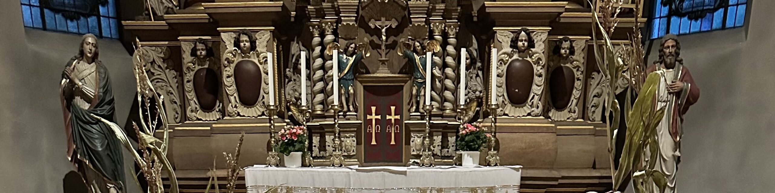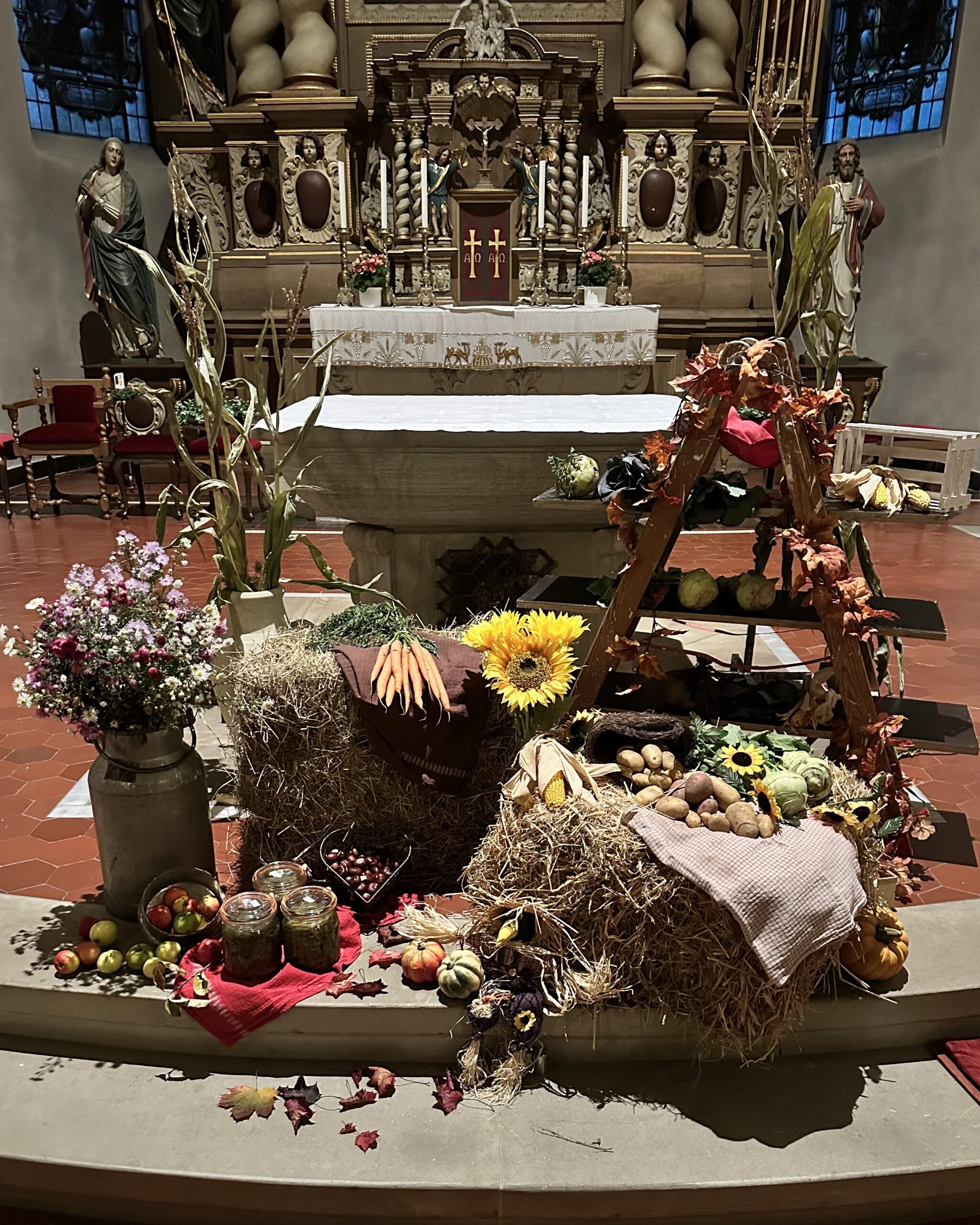 Zu Beginn der Predigt wurde ein Rollenspiel gestaltet, welches von Mitgliedern der KLJB vorbereitet und von Kindern aufgeführt wurde. Es handelte vom Erntedankfest und der Erstkommunion und verband auf anschauliche Weise, Erntedank, Gemeinschaft und Glauben. Mit viel Engagement und Kreativität gelang es den Kindern, die Botschaft des Erntedankfestes und der Erstkommunion lebendig werden zu lassen. Im Anschluss an das Rollenspiel bezog Pastor Matthias Kamphans die Kinder in seine Predigt mit ein. Die Kinder waren dabei sehr aufmerksam und aktiv, sodass eine lebendige Gesprächsrunde entstand. Besonders die Frage „Wie oft sagen wir eigentlich am Tag Dankeschön?“ regte viele zum Nachdenken an und führte zu schönen Beiträgen der Kinder über Dankbarkeit im Alltag.