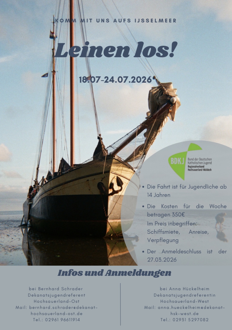 In der ersten Woche der Sommerferien gibt es vom 18.-24.07.2026 wieder einen Segeltörn auf der Nordsee ab Harlingen oder dem Ijsselmeer. Zu dieser für viele sicherlich besonderen Erfahrung sind alle Jugendlichen ab 14 Jahren herzlich eingeladen.