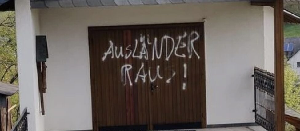 Jetzt sind auch die Kirche und die Friedhofskapelle in Hesborn beschmiert worden. An der Kirchentür prangt am frühen Samstagmorgen ein großes Hakenkreuz, an der Tür zur Friedhofskapelle steht „Ausländer raus“.